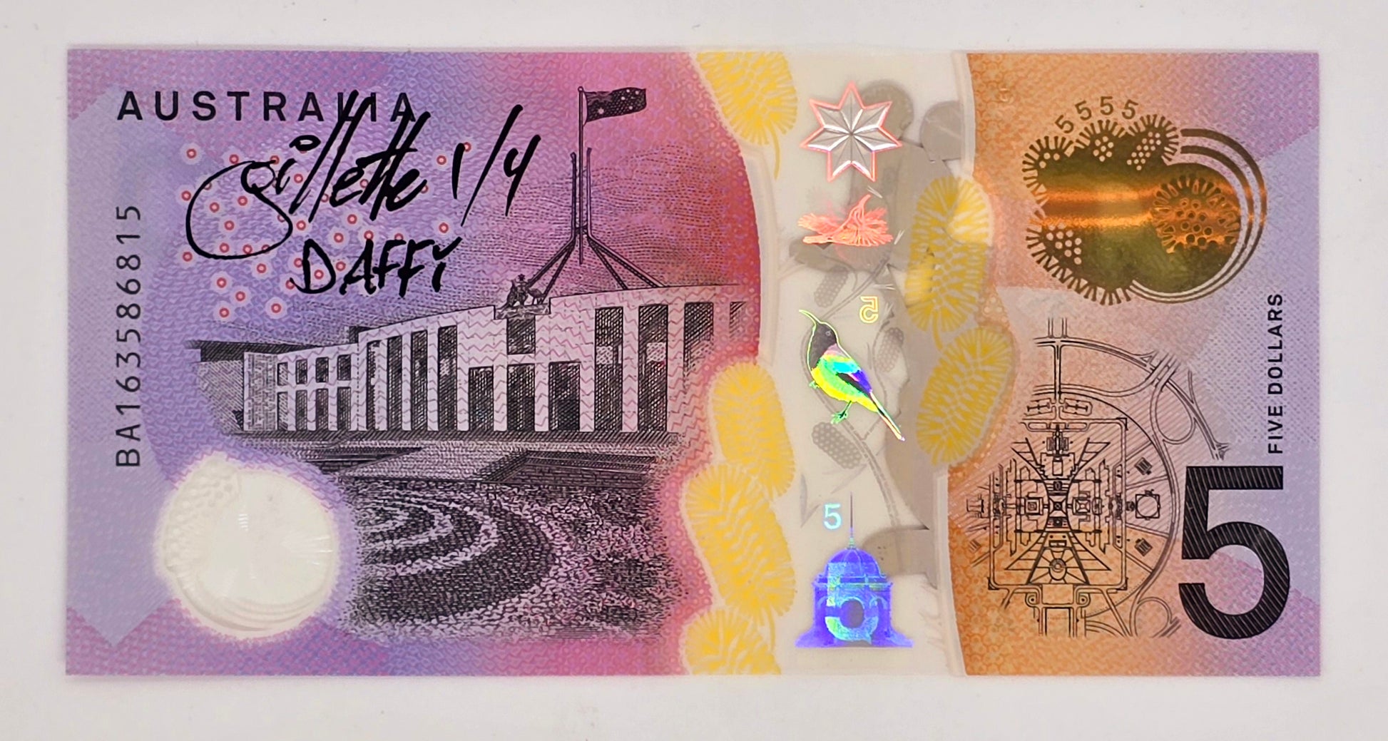 Collage on uncirculated* 2023 AUD $5 banknote (polymer)