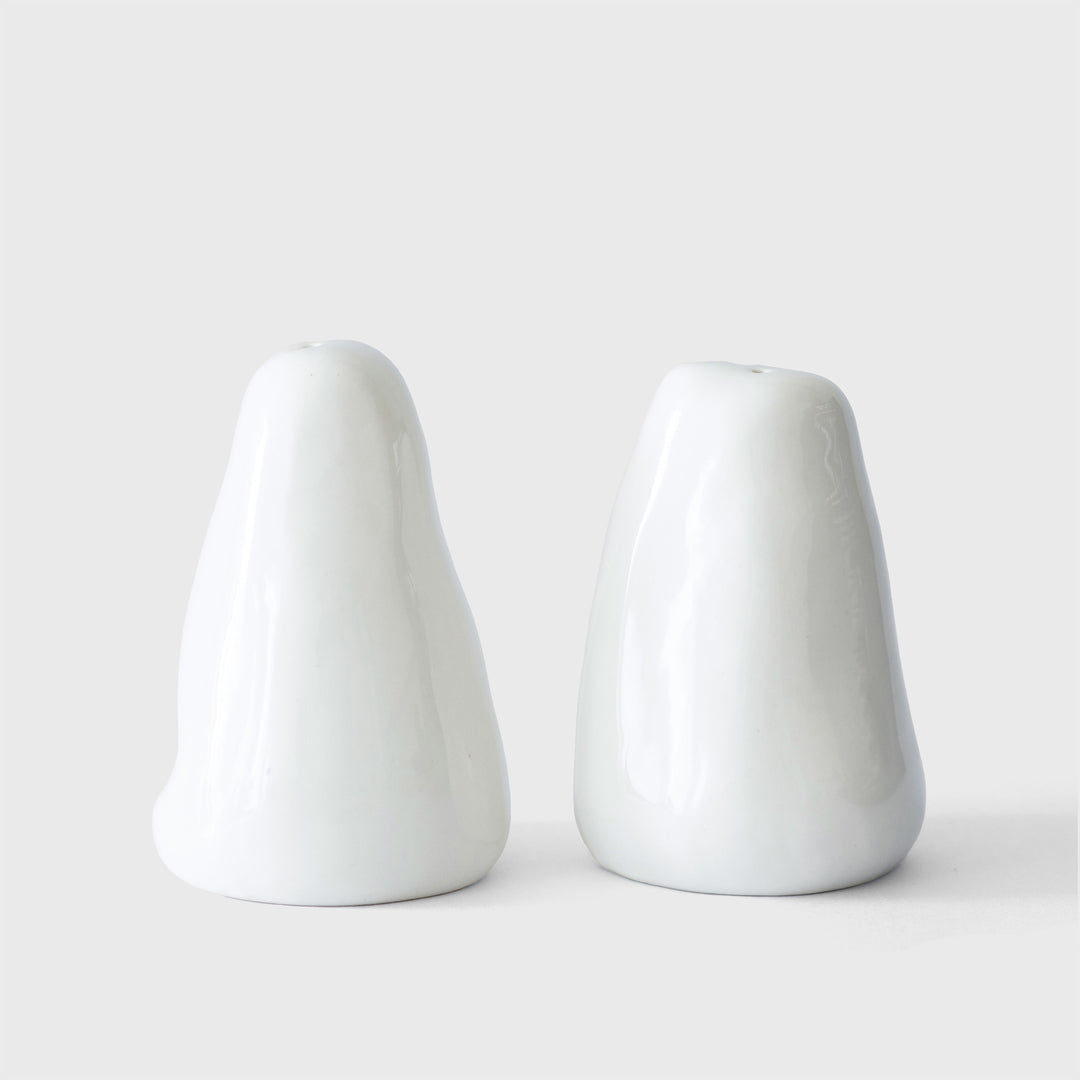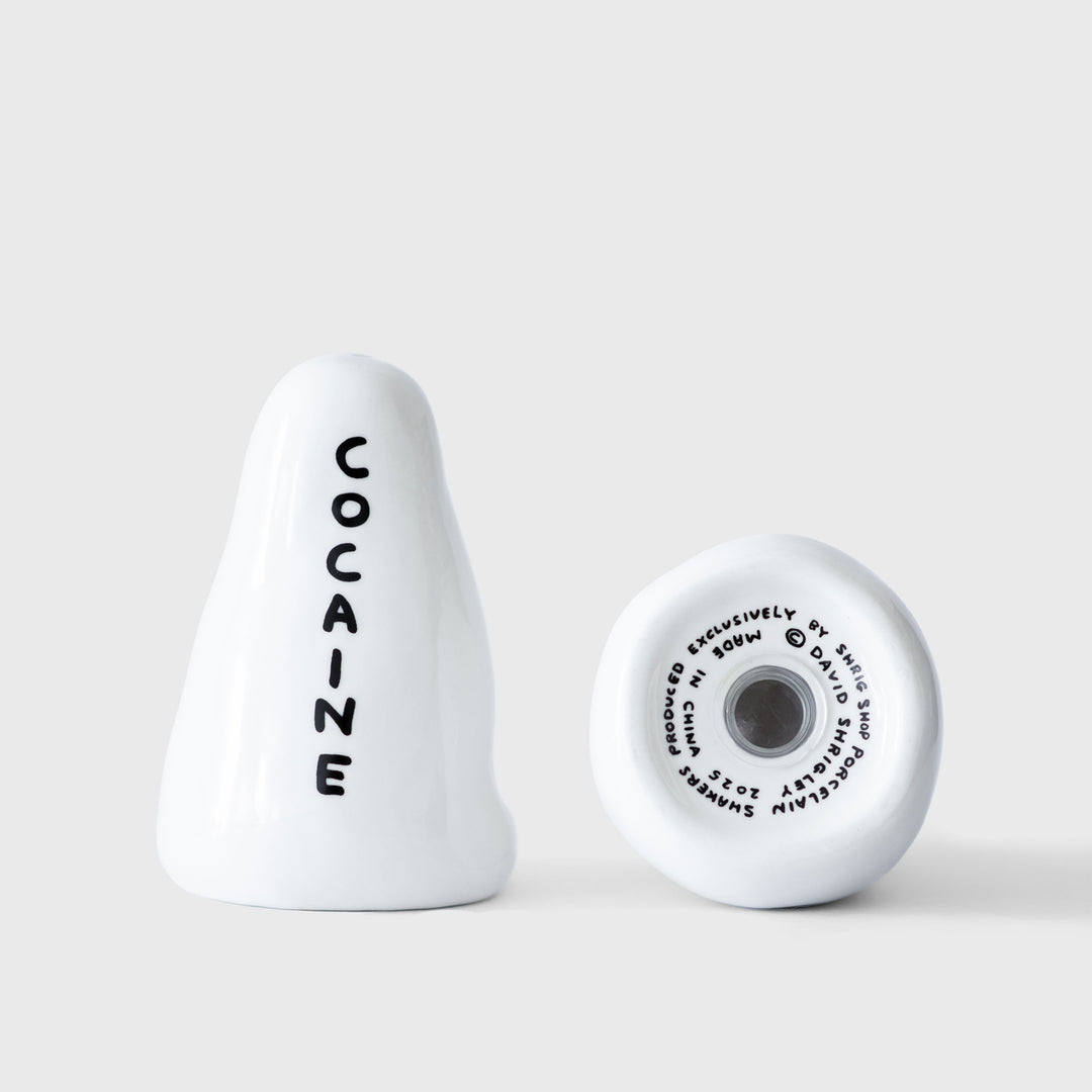 Cast porcelain sculptural salt & pepper shakers labelled Heroin and Cocaine